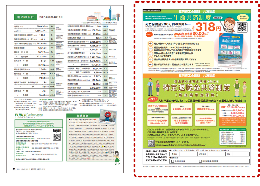 *本サービスは、当所の会員企業限定のサービスであることから、行政(福岡県・福岡市を除く)及びそれに付随する行政機関が 申し込む場合は、広告料金とは別途「会員限定サービス特別利用料」(15,000円・税込)を頂戴いたします(令和7年4月号封入分から適用)。