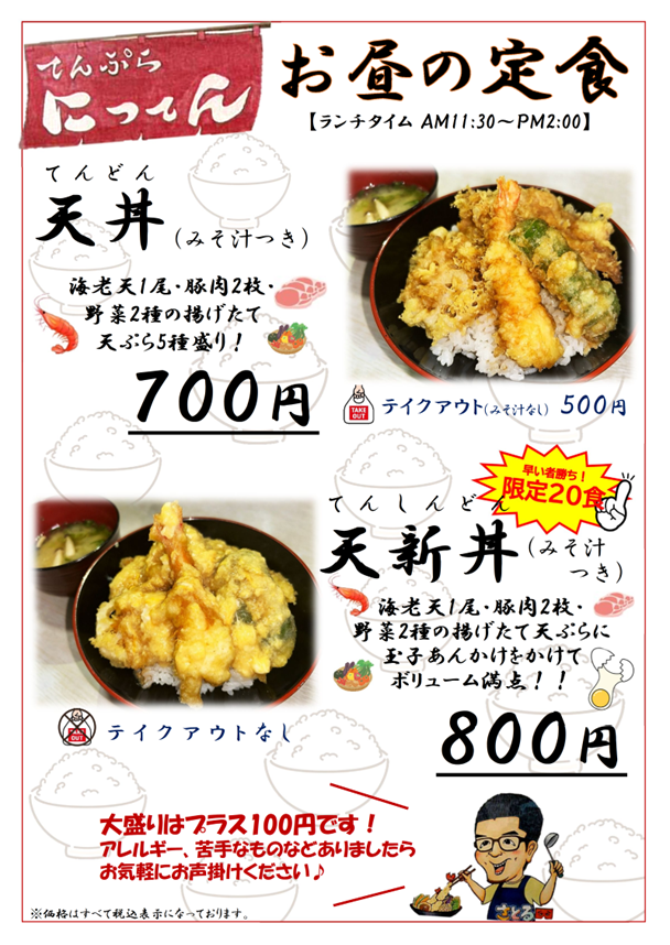 自慢は、毎朝博多せんしょうより仕入れる新鮮なネタ。常に揚げたてで提供される天ぷらは、季節折々の味が楽しめると大好評。 ●17時半〜20時は、ランチメニューと同じお食事を用意できます。