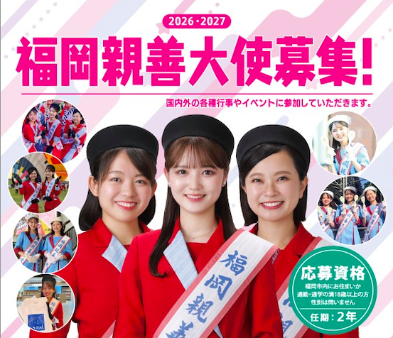 福岡市民の祭り振興会は、現任の「2024・2025福岡親善大使」の任期満了に伴い、新たに「2026・2027福岡親善大使」を募集いたします。